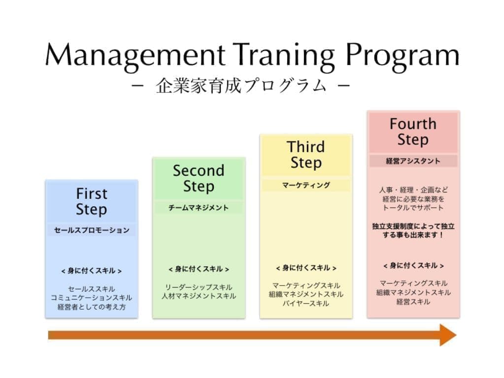 各ポジション毎に達成すべき基準は明確に決められていますが、期間は一切決まっていません。あなたの成長スピードに合わせてステップアップしていきます。業務を通じで各ステップの基準をクリアしていく中で、最終的に会社経営に必要なスキル・マインド・知識を身に付けることができます。